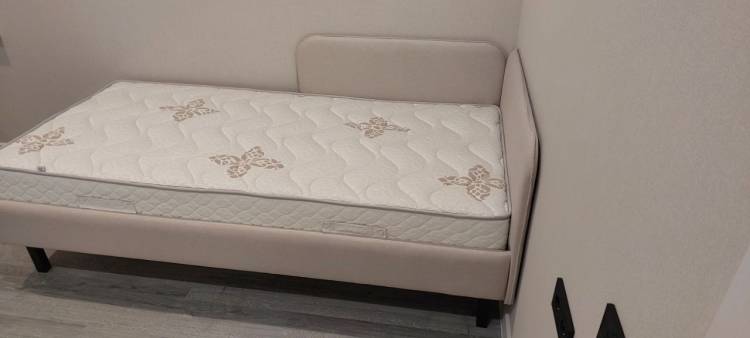 - Обивка кровати выполнена из мебельной ткани.